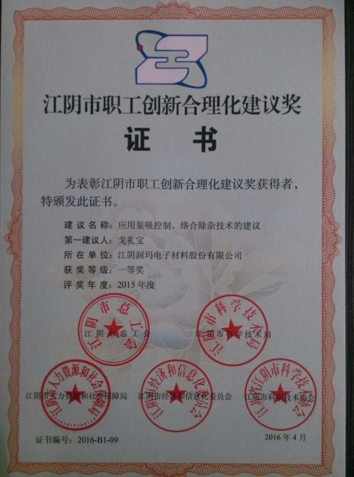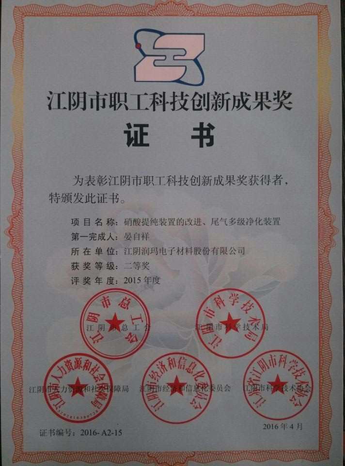 據江陰市總工會消息, 4月26日在江陰市慶“五一”先進表彰大會暨“當好主力軍,建功十三五”勞動競賽啟動儀式上,我公司三酸車間斬獲“2015江陰工人先鋒號”之殊榮,我司員工戈禮寶、晏自祥分別獲得“江陰市職工創(chuàng)新合理化建議獎”一等獎、“江陰市職工科技創(chuàng)新成果獎”二等獎。